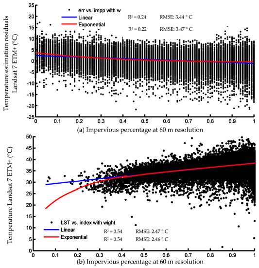 Linear (blue line) and exponential (red line) fits between temperature estimation residuals of Landsat 7 ETM+ and impervious percentage. (a) original DisTrad function; and (b) improved temperature estimation residuals’ disaggregation method.