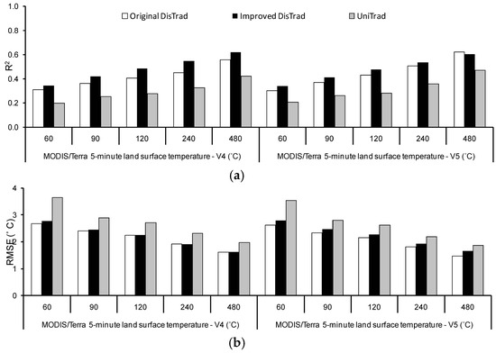 (a) coefficient of determination (R2); and (b) root mean square error (RMSE) between downscaled products of MODIS 5-min land surface temperature (V4 and V5) and observed Landsat 7 ETM+ land surface temperature at different resolutions (60, 90, 120, 240, and 480 m).