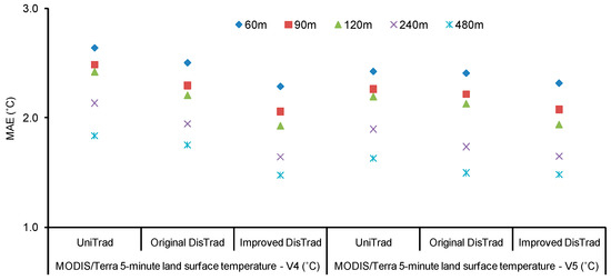 Mean Absolute Error (MAE) between downscaled products from MODIS/Terra 5-min land surface temperature (V4 and V5) using UniTrad, original DisTrad, and improved DisTrad, and observed Landsat 7 ETM+ land surface temperature at different resolutions (60, 90, 120, 240, and 480 m).