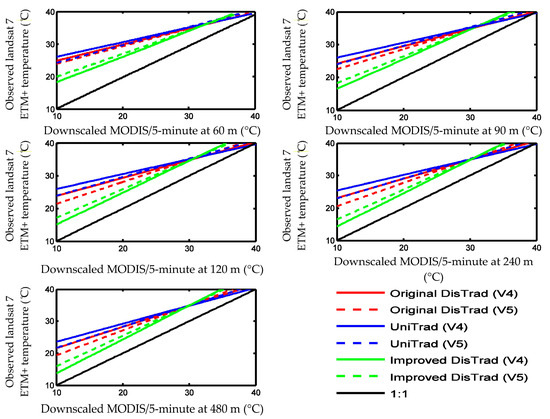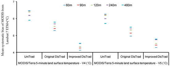 Figure 11 shows the systematic bias of the mean temperature between the Landsat 7 ETM+ land surface temperature image and the sharpened land surface temperature product of the downscaled MODIS\Terra land surface temperature (V4 and V5) using the three downscaling methods applied to all target resolutions. The improved DisTrad method shows the smallest systematic divergence (4.46 °C) from the observed Landsat 7 ETM+ land surface temperature image, while the original DisTrad (5.40 °C) and the UniTrad method (6.17 °C) show the highest biases. A smaller systematic bias is related to an average image value closer to the average Landsat ETM+ land surface temperature image, and this results from a better estimation of land surface temperatures.