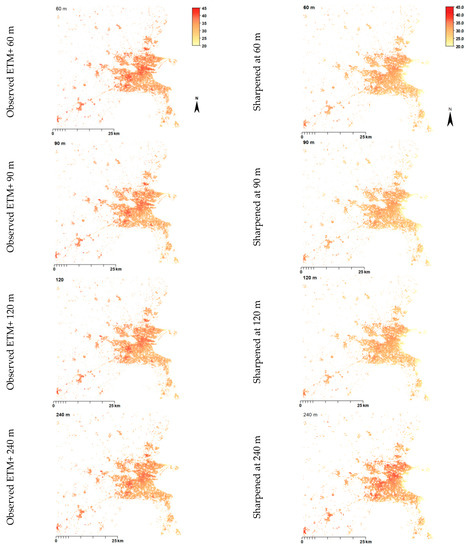 The left side maps are the observed land surface temperature in degrees Celsius derived from Landsat ETM+ band 6 (acquisition date 24 May 2001) at different resolution (60 to 480 m). The right side maps are the sharpened images at the different spatial resolutions, obtained by using the improved DisTrad methodology to downscale the MOD11_L2 (5-min–V4) 960 m resolution image.