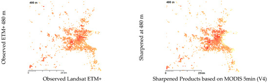 Downscaling was applied to obtain land surface temperatures from the original 960 m resolution to higher resolutions of 60, 90, 120, 240, and 480 m. Evaluation with the coincident thermal Landsat 7 ETM+ image was used to evaluate the downscaled products of the 5-min MODIS/Terra land surface temperature. However, a validation to evaluate the downscaled products of the temporally averaged MODIS/Terra land surface temperature images, 1-Day MODIS/Terra product MOD11A1 and 8-Day MODIS/Terra product MOD11A2, was not possible because of its difference in time coverage.