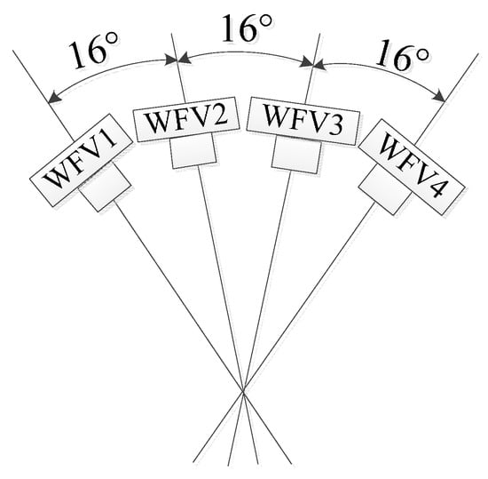 The GF-1 satellite is the first satellite in the Chinese High-resolution Earth Observation System (CHEOS), which was launched on 26 April 2013. It accommodates a panchromatic and multispectral (PMS) sensor and a WFV sensor, both of which are designed to provide optical push-broom imagery [5,8,11]. From its configuration shown in Figure 1 [12], the WFV sensor is very representative of a space-borne multi-camera mosaic imaging sensor in CHEOS because it is integrated with four cameras to achieve an 800-km splicing swath at a 16-m spatial resolution. The view angle of each camera’s principal optic axis is approximately 16° apart. Each camera has four bands (450 nm–520 nm blue, 520 nm–590 nm green, 630 nm–690 nm red and 770 nm–890 nm near-infrared), and its data are quantized into 10 bit. The revisit time, determining the calibration frequency, is around four days without platform side-sway.