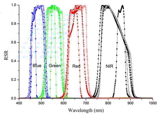 Figure 2 illustrates the Band 1–4 relative spectral responses (RSR) of WFV and MODIS, which reveals that the RSRs of four WFV cameras are very similar to each other and different from the RSR of MODIS. Therefore, this status should be considered in the radiance information extraction.