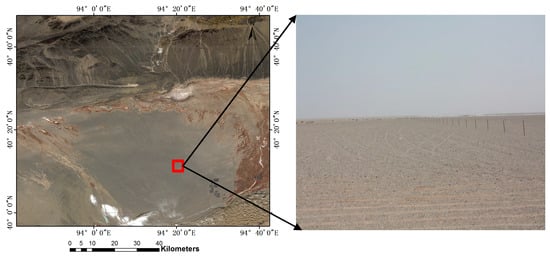 DRCS is an important radiometric calibration site in China, which has been widely recognized internationally due to its flat terrain, homogeneous surface and good radiation direction shown in Figure 3 [13]. The coefficient of variation (CV) (the ratio of the standard deviation and mean reflectance) of reflectance over DRCS is about 5% [5]. This site is officially used to obtain on-orbit absolute radiometric calibration coefficients for the visible and near-infrared sensor of Chinese land observation satellites by using the vicarious calibration method, such as the CBERS (China and Brazil Earth Resource Satellite), HJ (HuanJing), FY (FengYun), ZY (ZiYuan), GF-1, GF-2, GF-4, TH (TianHui), etc. [14,15,16,17]. DRCS is located about 25 km west of Dunhuang City in Gansu province. The latitude and longitude range is about 40.04°N–40.28°N, 94.17°E–94.5°E, and the altitude is up to 1200 m.