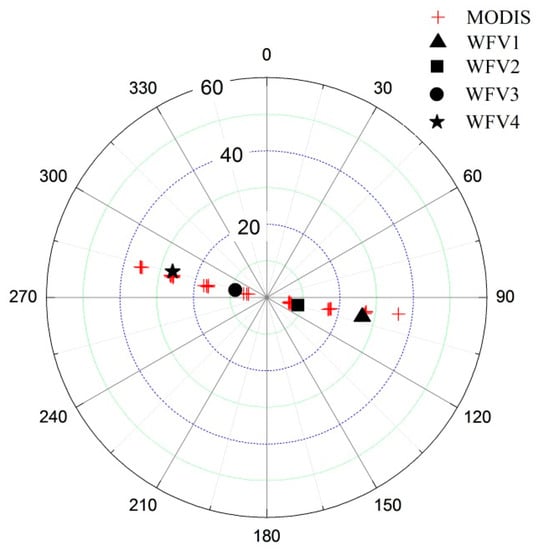 After being launched on 26 April 2013, the GF-1 satellite first underwent an important six-month commissioning phase period, which could improve the geometric and radiometric quality of the image to meet the demanding specification. Therefore, under these criteria, we retrieve the Terra MODIS and WFV image over the DRCS from October 2013–April 2015. Results show that after being filtered by the above criteria, the number of valid image pairs is not equal for each WFV camera: 5 for WFV1, 6 for WFV2, 6 for WFV3 and 9 for WFV4. The information of the collocated imagery is listed in Table 1. Figure 4 shows that the view angles for DRCS in the WFV and MODIS images are quite different, so that the bidirectional reflectance distribution function (BRDF) characteristic of DRCS needs to be taken into account [14,17].