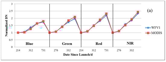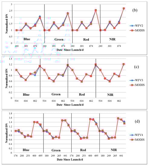 The trends of normalized DN of both GF WFVs and MODIS at each band. (a) WFV1 and MODIS; (b) WFV2 and MODIS; (c) WFV3 and MODIS; (d) WFV4 and MODIS.