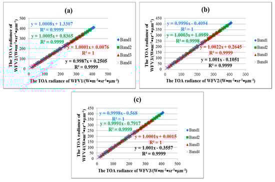 The TOA radiance correlation of the adjacent cameras. (a) WFV1 and WFV2; (b) WFV2 and WFV3; (c) WFV3 and WFV4.