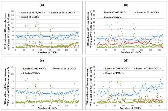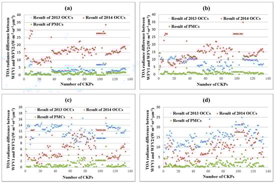 In order to estimate the effect and accuracy of the relative radiometric correction between cameras based on the PMCs, the CKPs are extracted from the overlapping regions of adjacent camera images in the same orbit at different phases. Then, the TOA radiances are calculated by both the PMCs and the OCCs. Figure 9, Figure 10 and Figure 11 illustrate the average absolute values of the TOA radiance differences of CKPs. In Table 6, the radiometric differences calculated with the PMCs are reduced to 1.12, 1.06, 1.04 and 1.34 W·m−2·sr−1·μm−1 for four bands in the overlapping region between WFV1 and WFV2; and to 0.80, 0.93, 0.64 and 0.71 W·m−2·sr−1·μm−1 for four bands in the overlapping region between WFV3 and WFV4, which is significantly less than the differences calculated with both the 2013 OCCs and 2014 OCCs. Only radiometric differences between WFV2 and WFV3 calculated from 2014 OCCs are comparative to the values from the PMCs. Statistical results reveal that better relative radiometric correction between cameras can be achieved with PMCs than the OCCs currently issued.