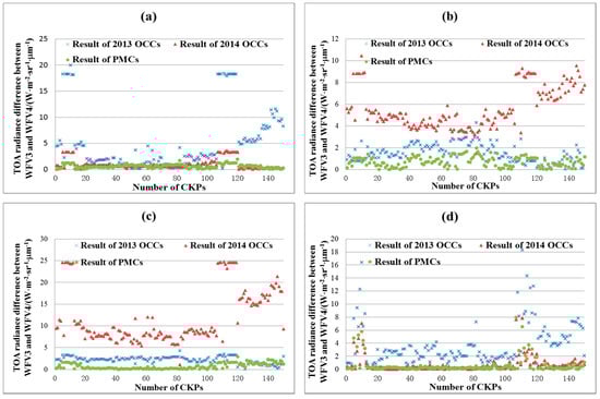TOA radiance differences of CKPs in WFV2 and WFV3. (a) Band1; (b) Band2; (c) Band3; (d) Band4.