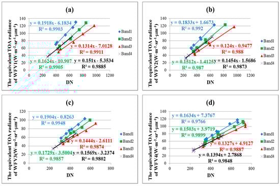 Each WFV camera calibrated by the cross-calibration method. (a) WFV1; (b) WFV2; (c) WFV3; (d) WFV4.