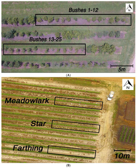 Commercial cultivation data was collected from a farm located in Alma Georgia (31°31′18.6″ N 82°23′25.1″ W). The bushes were planted with 61 cm between bushes for Meadowlark and Star, and 71 cm between Farthing bushes. The gap between rows was 3.5 m. At this farm, a few ubiquitous southern highbush varieties were grown in hedgerows: Star, Farthing, and Meadowlark (Figure 1B). The bushes at this location are 3.5 years old and have the same cultivation practices. The pruning for the varieties had some variance. The tops of the Farthing, which grow taller than the Star and Meadowlark, were trimmed. The Star and Meadowlark were more drastically hedged on their sides.