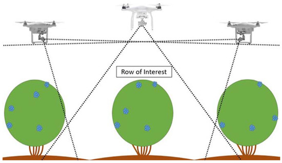 Images for a preliminary data (bushes 1–12) set were collected in the horticulture research farm on 23 April 2017, between rainfall under heavy cloud coverage, which provided favorable diffuse lighting, and an unfavorable breeze. A second set (bushes 13–25) was acquired on 29 June 2017 under the same conditions to increase sample size (Figure 1A). Images and video were taken using a DJI Phantom 3 Advanced quadcopter (DJI Inc., Shenzhen, China). The UAS acquired 12 MP images and a 4.1 MP video as it flew routes pre-programmed in Litchi (VC Technology Ltd, London, UK), a remote pilot application. The camera’s sensor is a 1/2.3” CMOS and has a fixed focal length (20 mm) and aperture (f/2.8). The UAS was programmed to fly next to the row of interest at an altitude of 3 m with the camera pointed directly at the row of interest for oblique (~45 degree) images and over the row of interest at an altitude of 4 m for nadir images (Figure 2). The quadcopter captured images/video with the camera pointed perpendicular to the row, as well as at 45 degree angles to the left and right (Figure 3). These three angles for each of the three positions ensured maximum coverage of the bush canopy and crown.