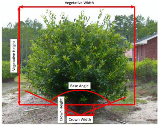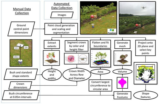 Unmanned aerial systems (UASs) are rising in popularity for applications in high-throughput phenotyping due to their capability of data collection with a high spatial and temporal resolution [14]. UASs have been used to determine the height and canopy growth rates of cotton [15], wheat [16], rice [17], trees [18], and other crops. There has been limited research into using 3D models developed from UAS acquired images to examine plant architecture. Height [18] and crown diameter have been assessed in olive trees from aerial imagery [19]. Vineyard macro-structure such as row width, spacing, height, and orientation have also been measured [20]. Tree volume has been measured by tractor and tripod mounted LIDAR [21,22] and bare tree volume has been assessed by UAS, terrestrial LIDAR, and handheld cameras [23,24]. To the best of our knowledge, the application of low altitude UASs to acquire oblique imagery of leafy bushes for the extraction of morphological parameters has not been explored. In particular, morphological traits that are associated with machine harvestability such as crown size and bush shape have not been investigated. This is likely due to the difficulty in imaging bush crowns and the underside of canopies. If morphological traits can be extracted without field labor, the cost and time required for breeding studies will be greatly reduced. Applying this technology to blueberry breeding may provide growers with cultivars that can be machine harvested without significant ground loss.