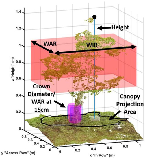Width in row (WIR) and width across row (WAR) are calculated by calculating the difference of the minimum and maximum coordinates along the respective axis (Figure 6). Canopy area is determined by projecting all bush points into the x-y plane and determining the area of the projected bush. A rectangular area can be determined based on the extents of the bush. The tightest fitting boundary for the points provides a canopy area in addition to a convex hull.