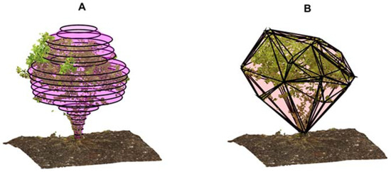 On 24 April 2017, manual measurements of the reference objects and first set bushes were recorded in the horticulture research farm. The second set of manual measurements were recorded on 30 June 2017. The bush height recorded was the distance from the highest reaching point on the bush to the ground directly below. The in-row and across-row widths were found by placing boards vertically on either side of the bush, perpendicular to the axis along which the width was being measured, and the distance between boards was measured and recorded. Bush volume was collected by measuring the circumference of bushes at 5 cm intervals in the vertical direction. The circumference measurements of the bush were converted to diameters; under the assumption that bush cross sections are mostly circular. The bushes were then modeled as stacked frustums, from which the volume was determined (Figure 8A). This volume was later compared to the convex hull mesh generated using the boundary function (Figure 8B). The largest area of the bush based on the assumption of circularity served as the bush canopy area. Collecting all manual measurements for a bush took up to 8 min (depending on bush size) with the cooperative effort of three people.
