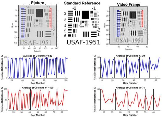 We hypothesized that recording a video and extracting frames would produce better results due to the high sampling frequency (29.97 Hz) of the video as opposed to the interval image collection (0.5 Hz) of the camera. To test the image and video resolution of the camera, the 1951 USAF test pattern was recorded and photographed at a distance of 50 cm from the camera lens. For both video and image collection, the ISO was set to 100 and an exposure bias of 0.0 was achieved. For the camera, this was achieved with a 1/60 s shutter speed. A single frame was extracted from the video using FFMPEG (FFmpeg.org Version 3.3). The images were converted to black and white using MATLAB’s ‘rgb2gray’ function. Pixel columns perpendicular to the line pairs were selected and averaged in the horizontal direction. These values were plotted as relative reflectance. If not all three black lines per element result in troughs, then the group is considered to be unresolved. Also, if the ratio of peak to trough is less than √2, the lines are considered unresolved [25]