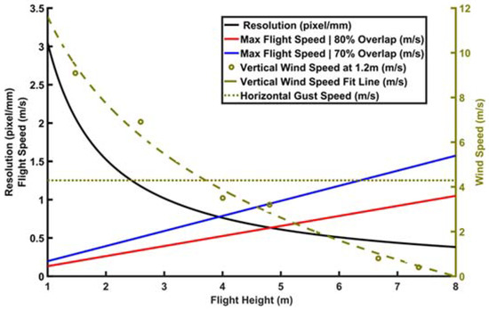 Image resolution, flight speed to maintain overlap, and vertical wind disturbance speed, each as a function of true flight height. Ambient gust speed displayed for reference.