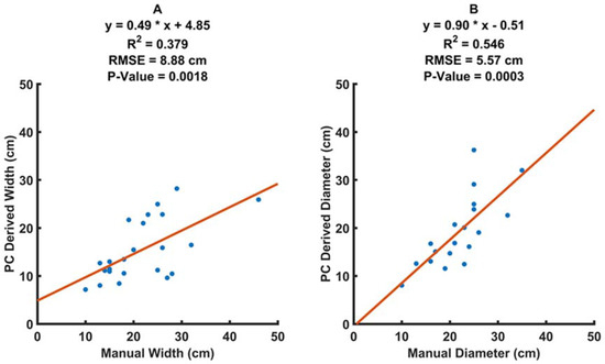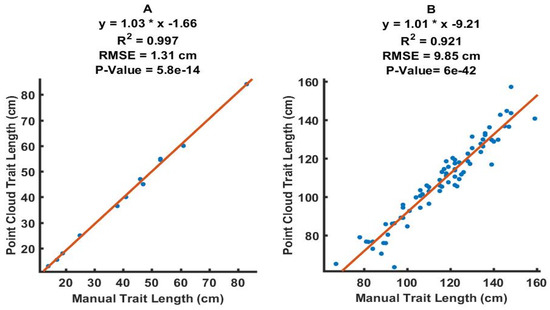 The point cloud derived extents of the reference objects (standard-shaped boxes and balls) had an RMSE of 1.31 cm. The bush extents showed a strong correlation (R2 = 0.921) (Figure 11). The RMSE between measurements of the bush extents was found to be 9.85 cm. The linear regressions show a systematic error of underestimation via an offset of −9.21 cm. When corrected for, the resulting RMSE is 5.82 cm. The extents of bushes are difficult to define for manual measurement. Bushes can seem to have multiple peaks of the same maximum height, but these maximums have varying distances to the sloped beds below.