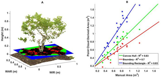 Bush point cloud projected (black) with the Convex Hull area (green), Boundary area (red), and Bounding Rectangle area (blue) shown (A). Correlation between point cloud derived areas and manual area (B).