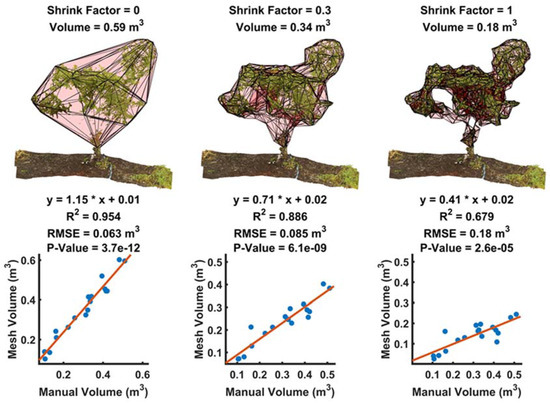 Bush point cloud with meshes generated with shrink factors 0, 0.3, and 1 and correlations of mesh volume to manual volume.
