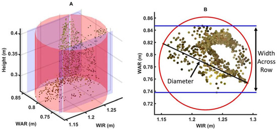 Crown point cloud and bounding cylinder (A) Projected crown with width across row and diameter shown (B).