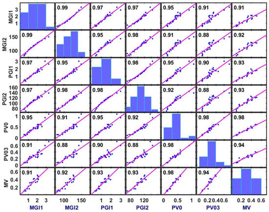 Correlations of growth indices (GI) and volume (V) in m3. ‘M’ and ‘P’ denote manually determined and point cloud derived data. PV0—shrink factor of 0, PV03—shrink factor of 0.3. All correlations are significant at α = 1 × 10−6.