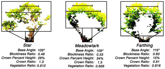 The Farthing bushes are the most distinguishable of the three varieties processed. In this study, Farthing have a square-like bush body shape, wide base angle, and short wide crowns (Figure 17). The Meadowlark and Star are more difficult to differentiate from each other, but the Meadowlark have slightly taller crowns and narrower base angles (Figure 18).