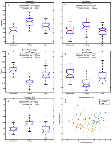 Boxplots and ANOVA tests of individual shape features (a–e) and Canonical score plot of five shape features combined (f).