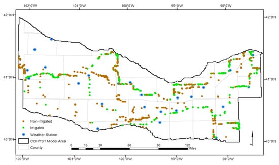 The hourly weather data used in SEBS were obtained from automated weather stations across the region (Figure 2) and downloaded from the High Plains Regional Climate Center (HPRCC) website (http://www.hprcc.unl.edu/). The instrumentation specifications for the measurement of air temperature, soil temperature, relative humidity, wind speed, wind direction, precipitation, and solar radiation are available on the HPRCC website (http://www.hprcc.unl.edu/awdn/ instruments/ manual.pdf). Digital Elevation Dataset (DEM) at 10-m resolution was downloaded from the Nebraska Department of Natural Resources website (http://www.dnr.ne.gov/elevation-data). The DEM data used in this study were resampled to a 30-m resolution using bilinear interpolation. Cropland Data Layer (CDL) [18] datasets available at 30-m resolution were retrieved from http://nassgeodata.gmu.edu/CropScape/. National Agricultural Statistics Service (NASS) county irrigation statistics were obtained from the USDA Farm Service Agency and were used as cross reference and verification of results on county aggregated irrigated croplands. Groundtruth data were collected across the COHYST region during the growing seasons of 2010, 2014 (Figure 2), and 2015. A sampling team methodologically traversed the region surveying land cover and land use data which included date, location, irrigation status, irrigation type, and crop type. Sampled fields were identified based on pre-determined data needs, and for accuracy assessment of irrigation classification. The data were logged directly into ArcGIS allowing quick geo-referencing in the field (Riverside Technology Inc., Fort Collins, CO, USA, [19]). In the 2010 growing season, 1103 locations (782 for irrigated and 321 for non-irrigated) were sampled, in the 2014 growing season, 464 irrigated and 355 non-irrigated were sampled, and in the 2015 growing season, 2246 locations were sampled, of which 611 were irrigated and 1635 were non-irrigated.
