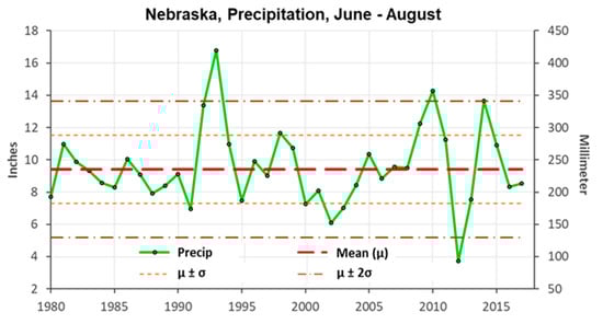 Nebraska precipitation average for the months of June, July, and August from 1980 to 2017; 1901–2000 mean precip (μ: 239.3 mm); and the standard deviations (σ: 2.11 mm) about the mean. Data source: http://www.ncdc.noaa.gov/cag/time-series/us.