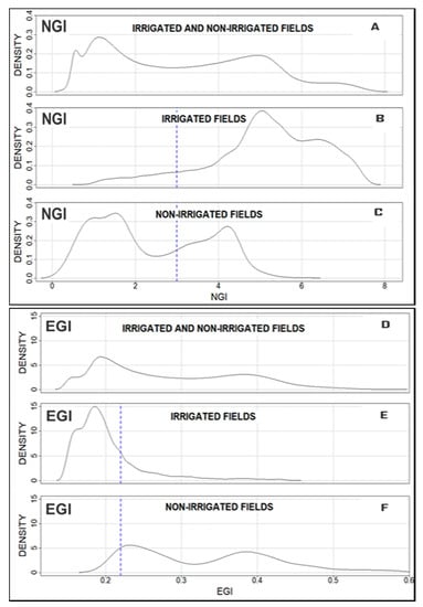 Figure 4A shows the bimodal distribution of NGI for both irrigated and non-irrigated pixels combined. The NGI distribution function isolated irrigated pixels to the right with a long tail to the left (Figure 4B). The NGI distribution function isolated most of the non-irrigated pixels to the left, with a bimodal function and short tail to the right. By comparing the x-axes of Figure 4B,C, it is important to notice that most of non-irrigated pixels were isolated to the long tail section of the irrigated distribution. Similarly, Figure 4D shows the bimodal distribution of EGI for both irrigated and non-irrigated pixels combined. However, in a reverse fashion, this distribution isolated irrigated pixels to the left and non-irrigated to the right (Figure 4E,F).