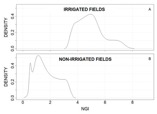 Empirical distributions of NGI index for irrigated and non-irrigated areas after the classification scheme has been applied.