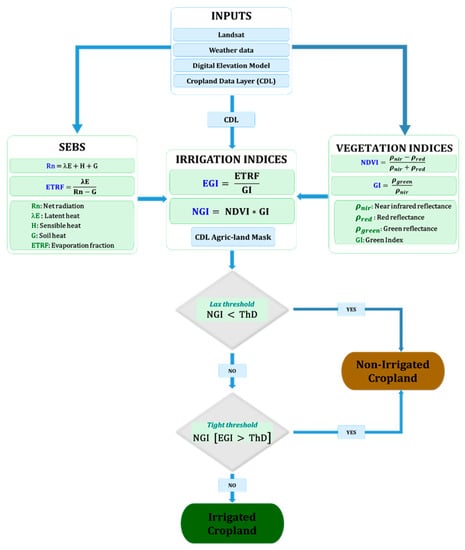 A conceptual flow diagram (Figure 6) describes the implementation of the scheme, including the data inputs, derivation of the indices, and thresholding of indices. Methodically, ETRF from SEBS, NDVI, and GI, are derived separately, and are formulated into EGI and NGI. A crop mask from CDL for the growing season is applied on the two indices to remove non-agricultural areas. The NGI as the based index, is thresholded first to remove non-irrigated pixels. The remaining non-irrigated pixels in NGI are then removed conditioned on EGI threshold. As shown in Figure 6, the non-irrigated pixels from the two thresholdings are combined to form the non-irrigated fields. The entirety of the scheme in Figure 6 is also referred to hereafter as the NDVI-Evaporation Fraction-Green Index (NEG) classification scheme.