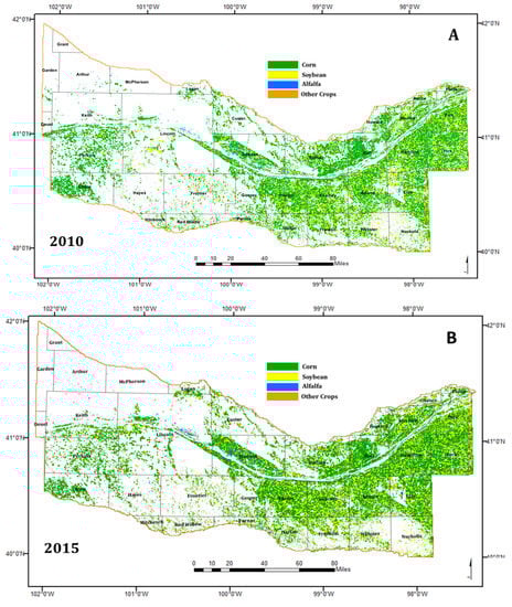 By far, the most grown and irrigated crops across the region were corn and soybean (Figure 7A,B). Sixty eight percent (68%) of the region in 2015 was irrigated corn and 28% was irrigation soybean. In 2010, 67% of the region was irrigated corn and about 31% was irrigation soybean (Table 2). Note that, because the classification scheme was applied during the intensive irrigation months of July and August, irrigated winter wheat, which is typically harvested from late June, may be fittingly classified as non-irrigated or as other short season crops. Therefore, despite winter wheat being a major crop in the region, the further classification of irrigated croplands into crop-types excluded winter wheat.