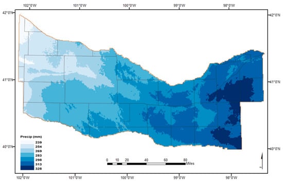 It is evident that the extent and intensity of irrigation in a region depends on four key factors: rainfall, water accessibility, topography, and soil type. The northwest, as part of the Nebraska Sandhills, is mostly sandy and semi-arid. During the three months (June, July, and August) of intensive irrigation in the region, rainfall distribution across the region decreases from east to west by 89 mm (239 to 328 mm), Figure 8. The difference is significant given that the average seasonal evapotranspiration for irrigated corn is 548 mm and 452 mm for soybean [39]. Precipitation may be a constraining factor, however, the main limiting factor of intensive irrigation expansion in the west is the nutrient-deficient and low water holding capacity sandy soils that dominate the region. Consequentially, the region is dominated by grass and pasture for ranching, winter wheat, and alfalfa. Nonetheless, close to the river basin in Keith, Perkins, and Lincoln counties, irrigation of major crops such as corn and soybeans is widespread. The spatial distribution contrast in the intensity of irrigation between the east and west of the region means that there is a higher groundwater and surface water consumption in the east than in the west.