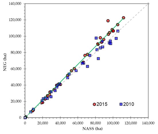 Regression between NASS and NEG irrigated area by county for 2010 and 2015.