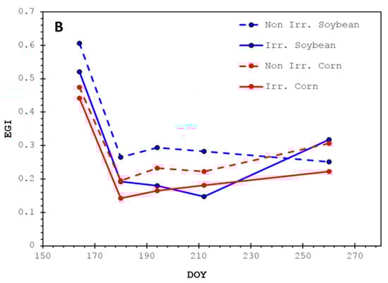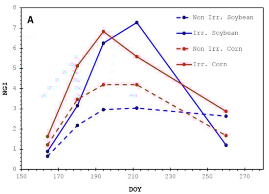 Seasonal profile of NGI (A) and EGI (B) for irrigated and non-irrigated soybean and corn during the 2014 growing season. Each data point is an average of nine contiguous pixels of a square. DOY denotes Day of Year.