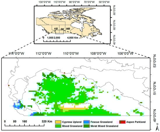 The 1/12° MODIS global land cover datasets, produced by the Global Land Cover Facility (GLCF) using standard MODIS land cover type products over the 2001–2012 period [46], were used to identify grasslands in the prairie ecozone. Considering the temporal change of land cover types, only the pixels classified as grassland from 2001 through 2012 were retained. As a result, there is a total of 1350 grassland pixels in the prairie ecozone (about 86,400 km2). Grasslands extend across the southwestern part of the Canadian prairie provinces: Alberta (AB), Saskatchewan (SK) and Manitoba (MB), across five ecoregions: Mixed Grassland, Moist Mixed Grassland, Cypress Upland, Fescue Grassland, and Aspen Parkland (Figure 1). According to the National Ecological Framework for Canada, each ecoregion is characterized by distinctive climate, soil, landform, and associated biological community as a subdivision of the prairie ecozone [47]. Most of the prairie grasslands (83%) are in the Mixed Grassland ecoregion, which typically contains species of short grasses (e.g., Blue Grama and Northern Wheat Grass (Agropyron cristatum)) and mid grasses (e.g., Western Wheatgrass (Pascopyrum smithii), Needle-and-Thread Grass (Hesperostipa comata) and June Grass (Koeleria macrantha) (Table 1). Moist Mixed Grassland, which contains 8.9% of the grasslands in the prairie ecozone, as usually composed of Western Porcupine Grass (Stipa curtiseta), Northern and Western Wheatgrass (Agropyron cristatum; Pascopyrum smithii) and Green Needlegrass (Nassella viridula). The remaining grasslands are distributed in Aspen Parkland (0.2%), Fescue Grassland (2.3%), and Cypress Upland (5.6%), of which Rough Fescue (Festuca scabrella) is the dominant species [34,35].