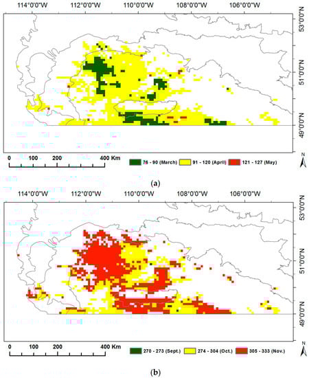 Long-term means of the start of growing season (SOG) (a) and the end of growing season (EOG) (b) of grasslands in the prairie ecozone over 1982–2014.