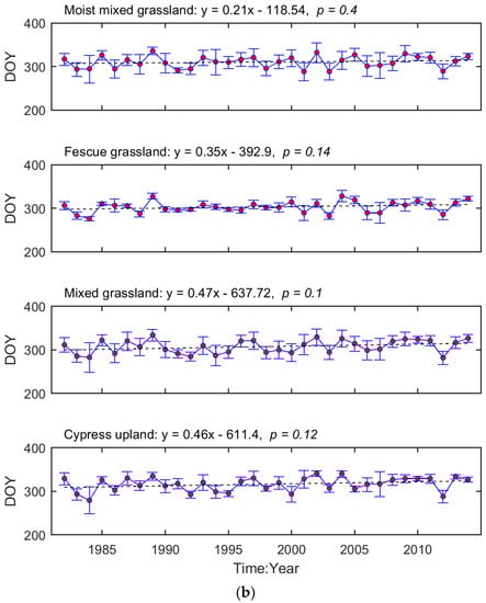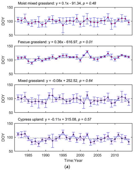 We summarized the temporal evolution of grassland phenology by ecoregion because each ecoregion is relatively homogeneous in climate and biological diversity as a part of the entire prairie ecozone [34], while Aspen parkland was excluded because of its extremely low proportion of grasslands. For each phenological metric and each year, we examined the region-wide distribution of per-pixel onset date. Then, we employed the interquartile range rule (i.e., the onset dates greater than the 75th percentile plus 1.5 times interquartile or smaller than 25th percentile minus 1.5 times interquartile are marked as outliers) [61] to detect the outliers of onset dates. The pixels that were not marked throughout 1982–2014 were retained. We then computed the mean and standard deviation of the dates of these pixels to show the region-wide average and variability of grassland phenology.