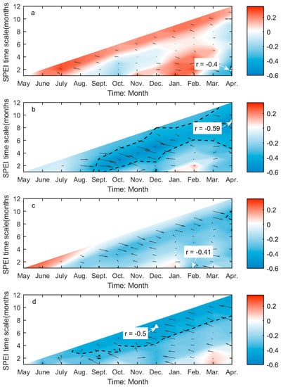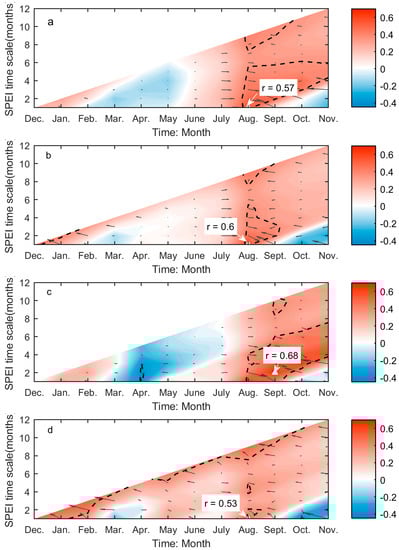The correlations (Adjrsq and r) between SOG and preceding drought conditions for Moist Mixed Grassland (a); Mixed Grassland (b); Fescue Grassland (c); and Cypress Upland (d). These graphs are generated based on the values of r and Adjrsq, that is, the colours and black arrows illustrate of the variability of the r (red: positive; blue: negative) and Adjrsq (the arrowhead points towards greater Adjrsq, and the length of arrow indicates the magnitude of variability) as the month of the year (MOY) (x-axis) and time scale (y-axis) of Standardized Precipitation Evapotranspiration Index (SPEI) change, respectively. The black dashed lines outline the regions of significant correlations (p < 0.05). The greatest significant correlation is marked with a white triangle, which is pinpointed by the white arrow. The r of the greatest significant correlation is presented by the text in the white box.