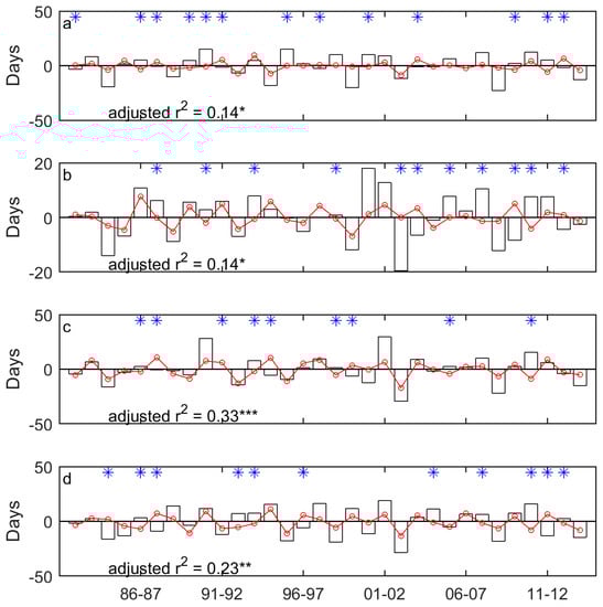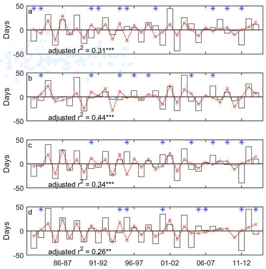 The year-to-year variability of SOG (unfilled bars) and the drought-induced shifts in SOG (red lines marked with red circles) for Moist Mixed Grassland (a); Fescue Grassland (b); Mixed Grassland (c); and Cypress Upland (d). * indicates that the signs of the drought-induced year-to-year variability of SOG and the whole year-to-year variability of SOG are different. * indicates p < 0.05, ** indicates p < 0.01, and *** indicates p < 0.001.