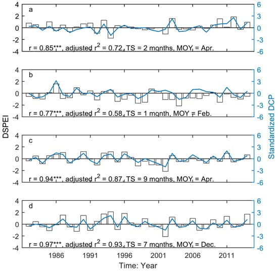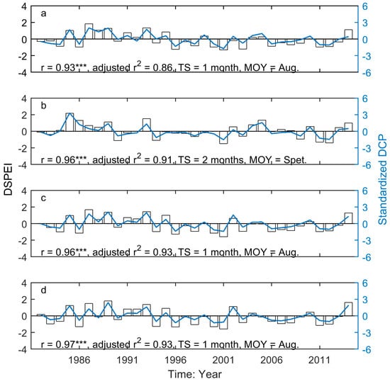The correlation between DSPEI (unfilled bars) and standardized DCP (blue solid lines) for the EOG of the grasslands of Moist Mixed Grassland (a); Fescue Grassland (b); Mixed Grassland (c); and Cypress Upland (d). *** indicates p < 0.001.