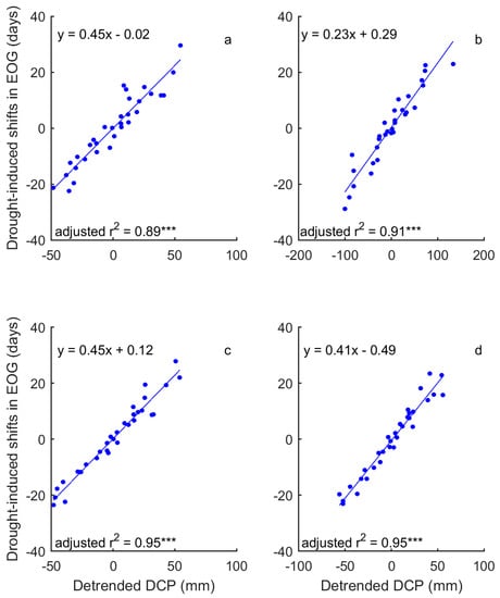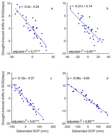 In a comparison of the time series of DSPEI and DCP, we highlighted the influence of precipitation on the drought conditions that dominate the changes of grassland phenology of the prairie ecozone. That is, DCP explains 58–93% and 86–93% of the variability of DSPEI for SOG and EOG of grasslands of the prairie ecozone, respectively (Figure 8 and Figure 9). We further quantified the impact of precipitation on the drought-induced shifts in grassland phenology. Our results show that DCP is negatively related to the drought-induced shifts in SOG, and every mm increase in DCP causes 0.06–0.21 days of advance in SOG (Figure 10). EOG, on the other hand, is positively related to DCP, and with every mm increase of DCP, EOG is delayed by 0.23–0.45 days (Figure 11).
