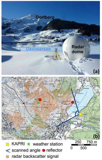 Davos test site. (a) the photograph shows the radar (inside a radome for weather protection), the reflective lake (Davosersee) and the observation area (Dorfberg); (b) map of the test site showing radar location and coverage, location of reflectors and the weather station.
