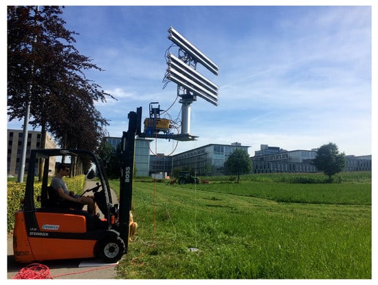 Hönggerberg experiment. The radar is mounted on a forklift to perform measurements at different elevations. In the near range, the lines of short cut grass separated by lines of piled grass and not yet mowed grass is visible. The observation area with a steeper slope is located at the far range and is not visible in the photograph.