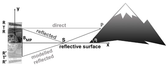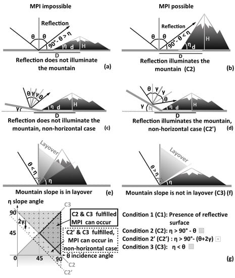 However, when planning a specific campaign where MPI cannot easily be ruled out, it is recommended to use the full inequality, to check whether MPI may occur. For non-horizontal reflective surfaces, condition C2 becomes more complex and involves the slope angle  of the reflection surface. The reflection illuminates the mountain if C2’  is fulfilled, where h is the height of the reflection (Figure 11c,d). With the same argument as for C2, we extract the rule of thumb that  needs to be fulfilled for MPI to occur.