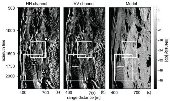 Radar backscatter images showing an MPI pattern at the Dorfberg test site in (a) horizontal and (b) vertical polarisation compared with (c) the modelled MPI. Area A1 highlights an area with a strong, low frequency MPI signal that are well visible in both polarisations and the model. Area A2 shows a higher frequency signal due to a steeper slope that are visible in the backscatter intensity image of the horizontal wave polarisation but hard to discern in the vertical polarisation and not present in the model. The white line corresponds to the central azimuth line used for the computation shown in Figure 6.