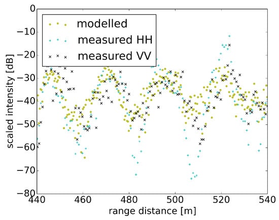 For a more quantitative assessment of the model accuracy, Figure 6 shows a comparison between the measured and modelled backscatter intensity signal along azimuth line 1750 shown as the white line L1 in Figure 5. The model correctly simulates the MPI pattern frequency. To reduce speckle, the signal of 10 neighbouring azimuth lines was averaged. For the sake of consistency, this was done for the measured and modelled dataset, even though the model does not have speckle. As polarisation of the waves and scattering properties are not implemented in the model, we only show the modelled data from the VV antenna pair, which differs from the HH pair only by a slightly different antenna location. Yellow dots represent the modelled intensity, black crosses the measured VV and turqoise plus signs the measured HH intensity from the December dataset. For easier comparison, the model intensity was scaled to match the order of magnitude of the measured intensity. Additionally, as already seen qualitatively in Figure 5, the amplitude of the MPI in the HH channel is roughly by a factor of 10 larger than in the VV channel.